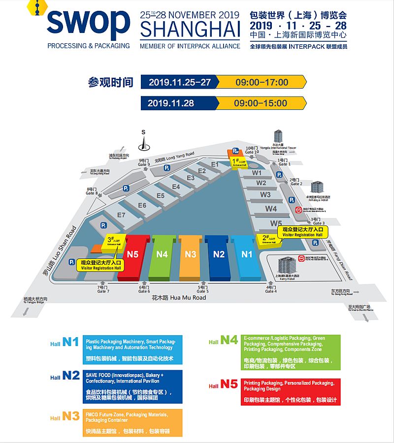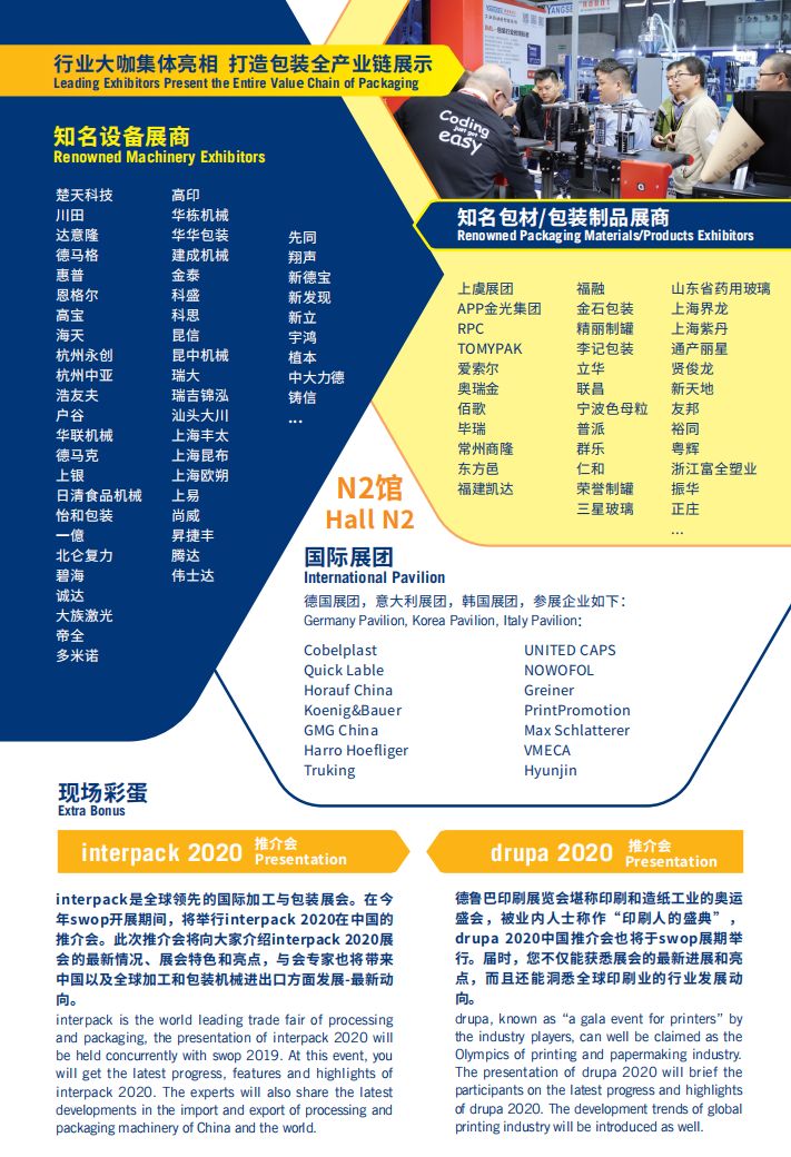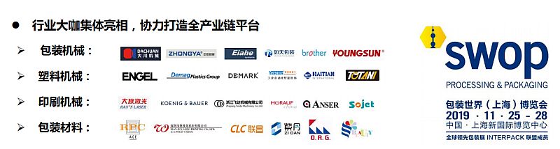 「swop2019 包装世界(上海)博览会」将于 2019 年 11 月 25-28 日(周一至周四) 在 举办。本届展会由雅式展览服务有限公司及杜塞尔多夫展 览(上海)有限公司强强联合主办,整合了食品、饮料、甜点、烘焙食品、医药、日化、 非食品消费品和工业产品等终端行业的加工与包装全产业链展览会。